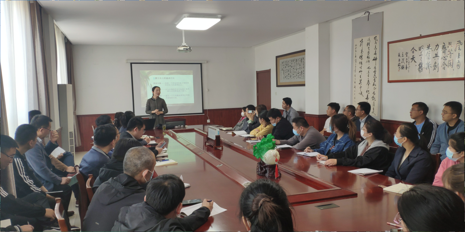 5月5號,為提高公司整體形象,提高員工業(yè)務(wù)水平,公司請禮儀老師來公司培訓(xùn),經(jīng)過老師的講解,公司開始實(shí)施全體員工著裝得體的政策,周一至周五全部著西裝、皮鞋。