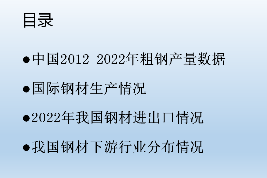 •我國現(xiàn)階段已經(jīng)初步實現(xiàn)城鎮(zhèn)化的建設,隨著房地產(chǎn)需求的下滑,我們普通鋼材很難有一個大的增量,但是我國的特殊鋼材還有很大的發(fā)展空間。結(jié)合國家鋼材發(fā)展現(xiàn)狀,我們也慢慢的理解公司制定“高端、國有、人無我有”政策的現(xiàn)實依據(jù),希望大家能出通過了解行業(yè)發(fā)展的方向,明確目標,開發(fā)客戶,更好的規(guī)劃自己的銷售,取得好的業(yè)績。